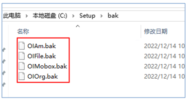 - Bak里面包括4個數據庫(OIAm、OIMobox、OIOrg、Oifile)的bak文件 (參考下圖)