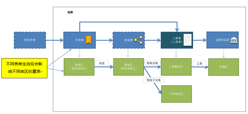 • 如果不需要檢驗,從收貨單直接到入庫單(上架單)。貨物的狀態設置為“合格”并且減<到貨區>該貨物的存儲量,加<入庫暫存區>該貨物的存儲量,貨物狀態改為“合格”。注意:在這個庫區,貨物的這個狀態是可以支持不上架直接出庫了。這種情況在生產型企業還是比較普遍的。