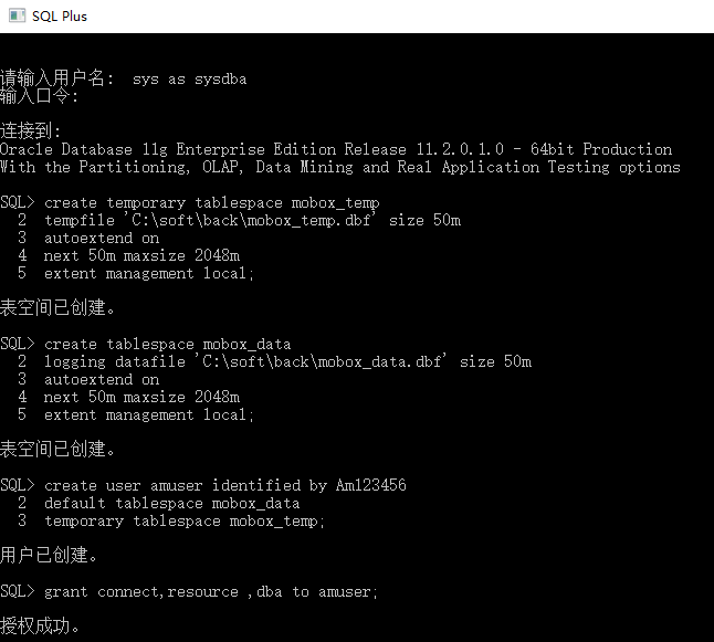 2、通過(guò)sqlplus創(chuàng)建oracle數(shù)據(jù)庫(kù)連接賬號(hào)(并創(chuàng)建空間、設(shè)置權(quán)限等),比如:amuser; (若甲方可以提供system賬號(hào)及密碼。當(dāng)前步驟可以不做
