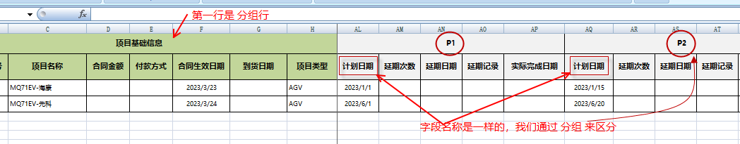 我們可以看到,excel第一行是分組行(項目基礎信息,P1,P2)