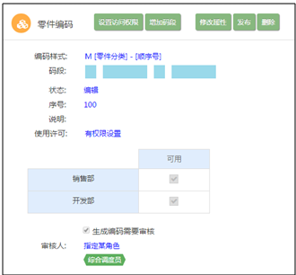 上圖所示,零件編碼只允許“銷售部”“開發部”使用,申請編碼時需要由“綜合調度員”進行審核