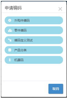 操作者點擊“編碼申請”功能點后,系統彈出如下圖所示的彈框,列表顯示所有操作者有權使用的編碼。注意:系統在編碼的定義里就做了一定的限制,在編碼定義里可以設置企業里哪些人、角色、部門允許使用哪種編碼。
